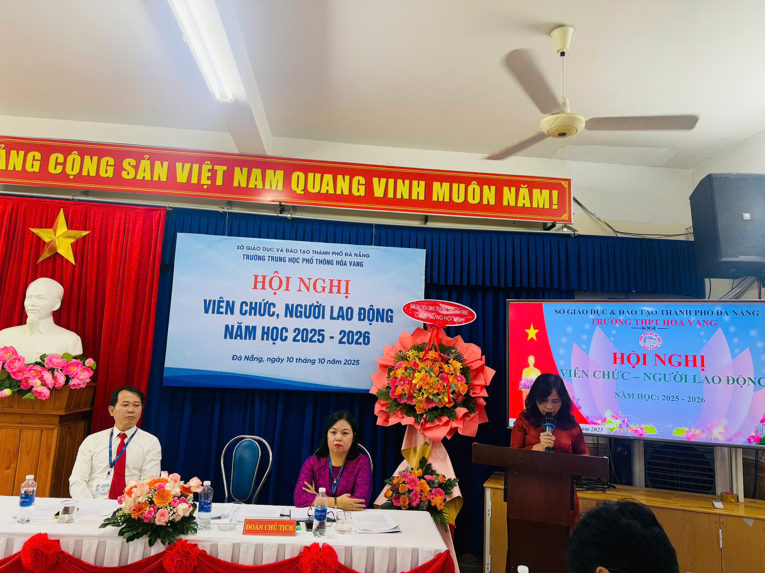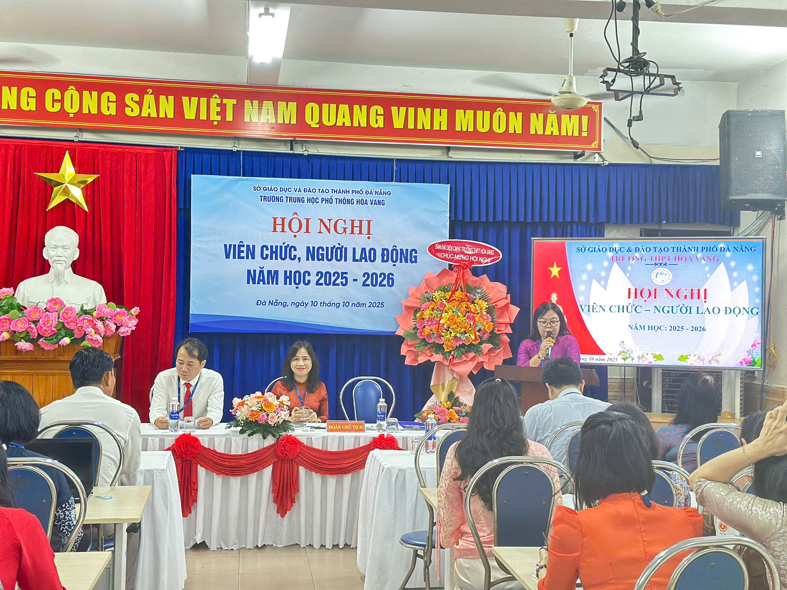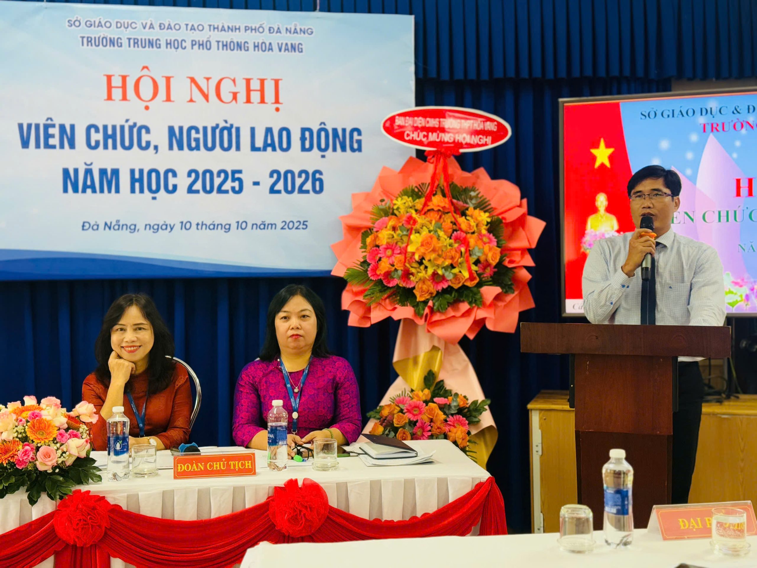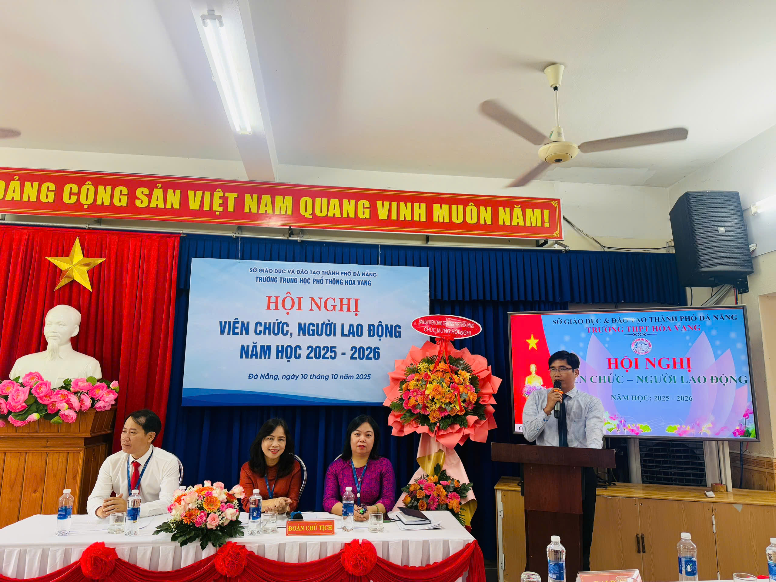 Thực hiện Công văn số 1415/SGD ĐT-VP ngày 1/10/2025 của Sở GD&ĐT thành phố Đà Nẵng về việc tổ chức Hội nghị công chức, viên chức, người lao động ngành giáo dục năm học 2025-2026, sáng nay, ngày 10/10/2025, Trường THPT Hoà Vang long trọng tổ chức Hội nghị viên chức, người lao động năm học 2025 – 2026.