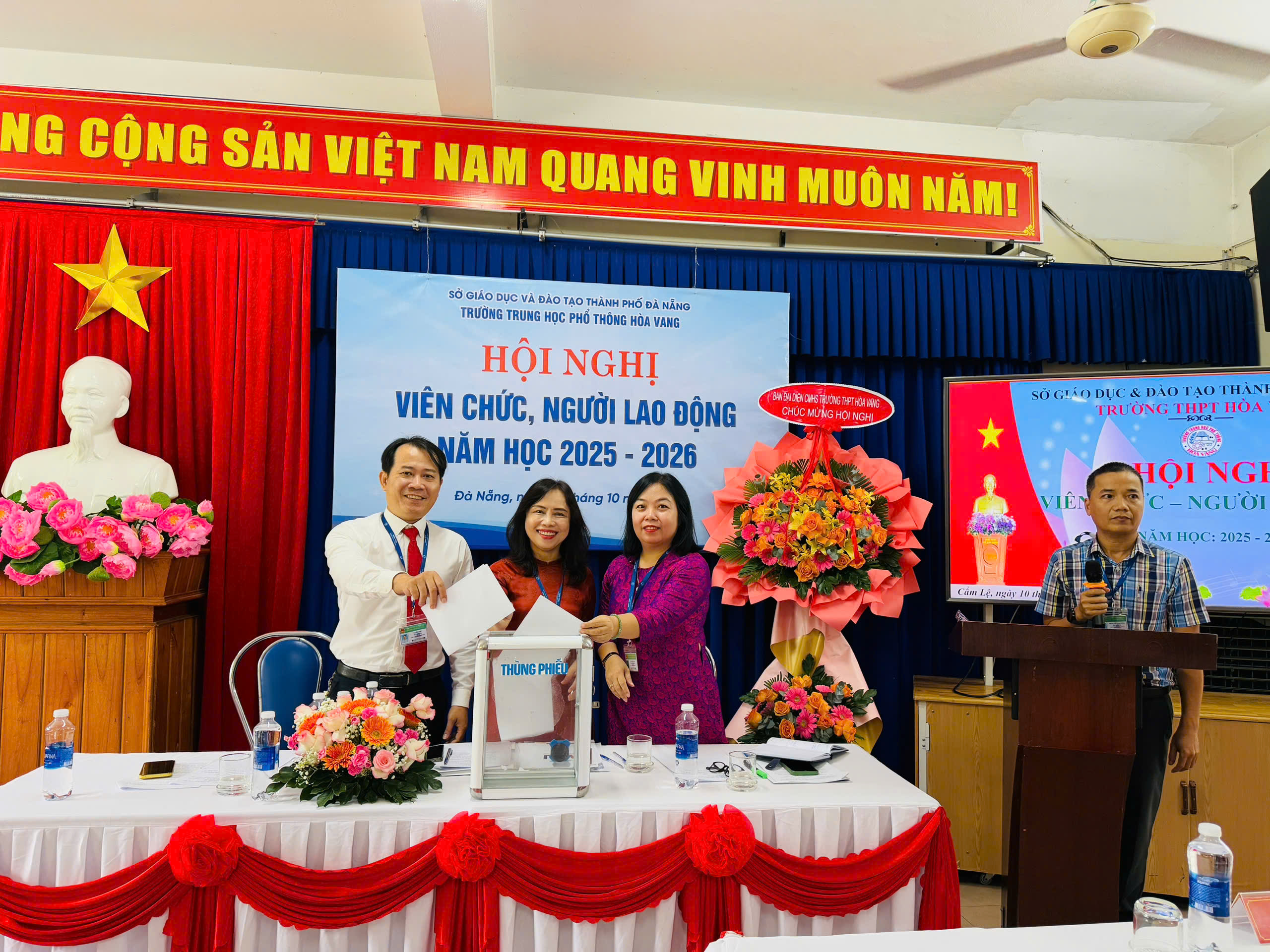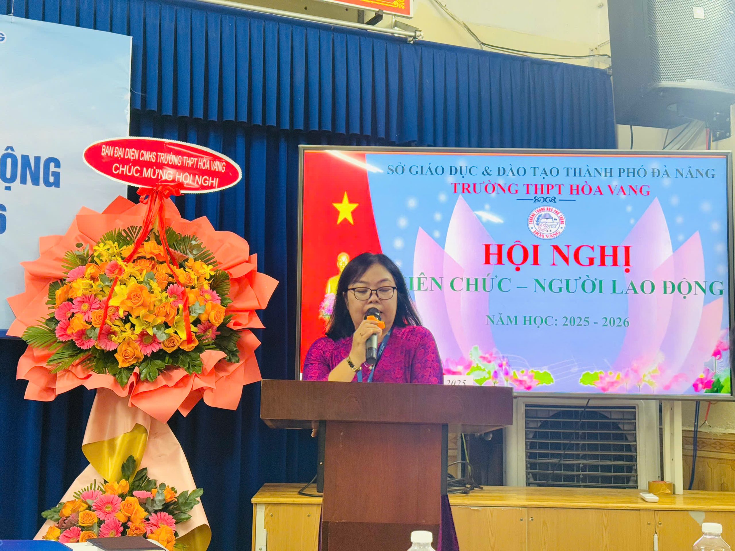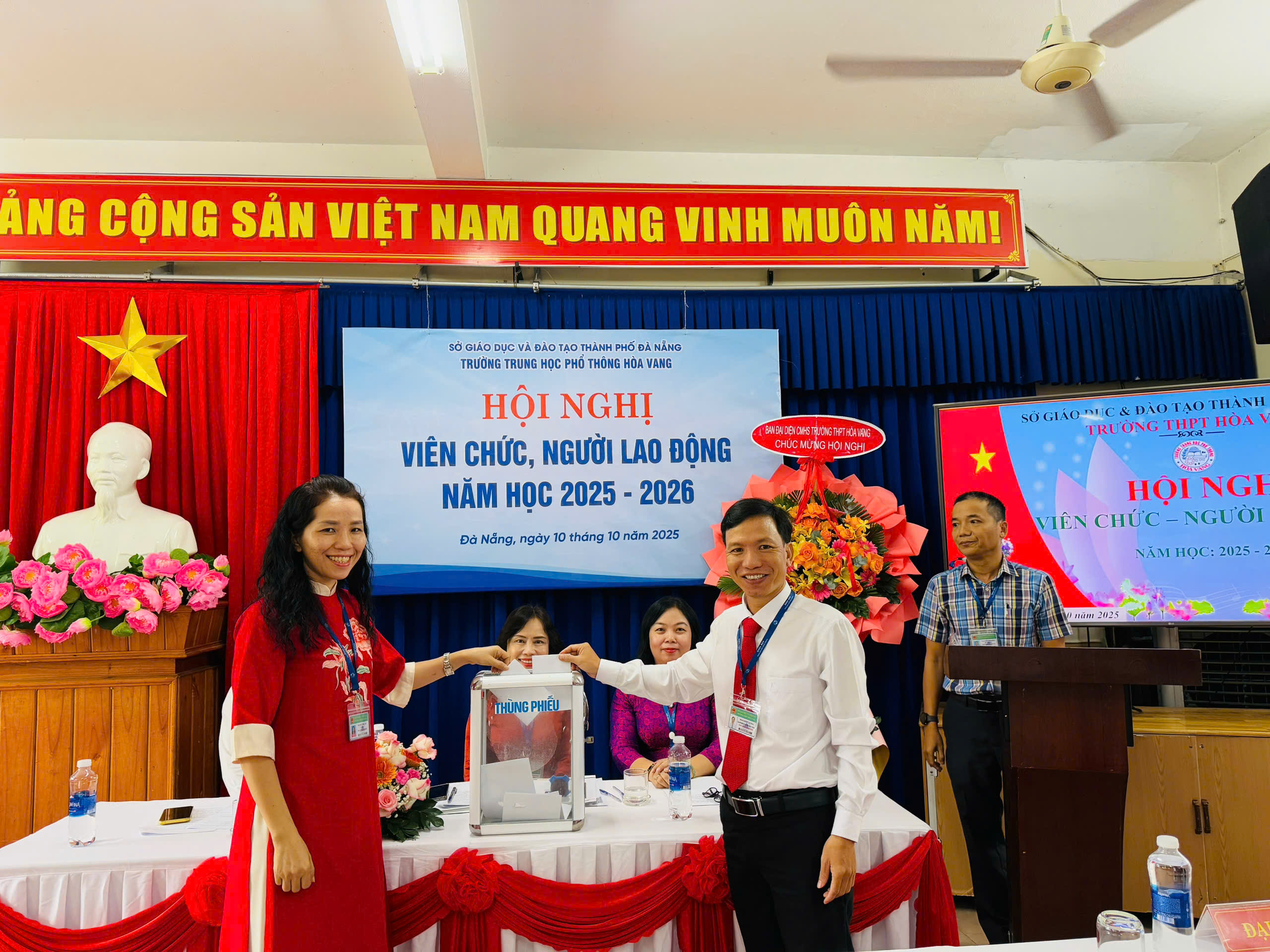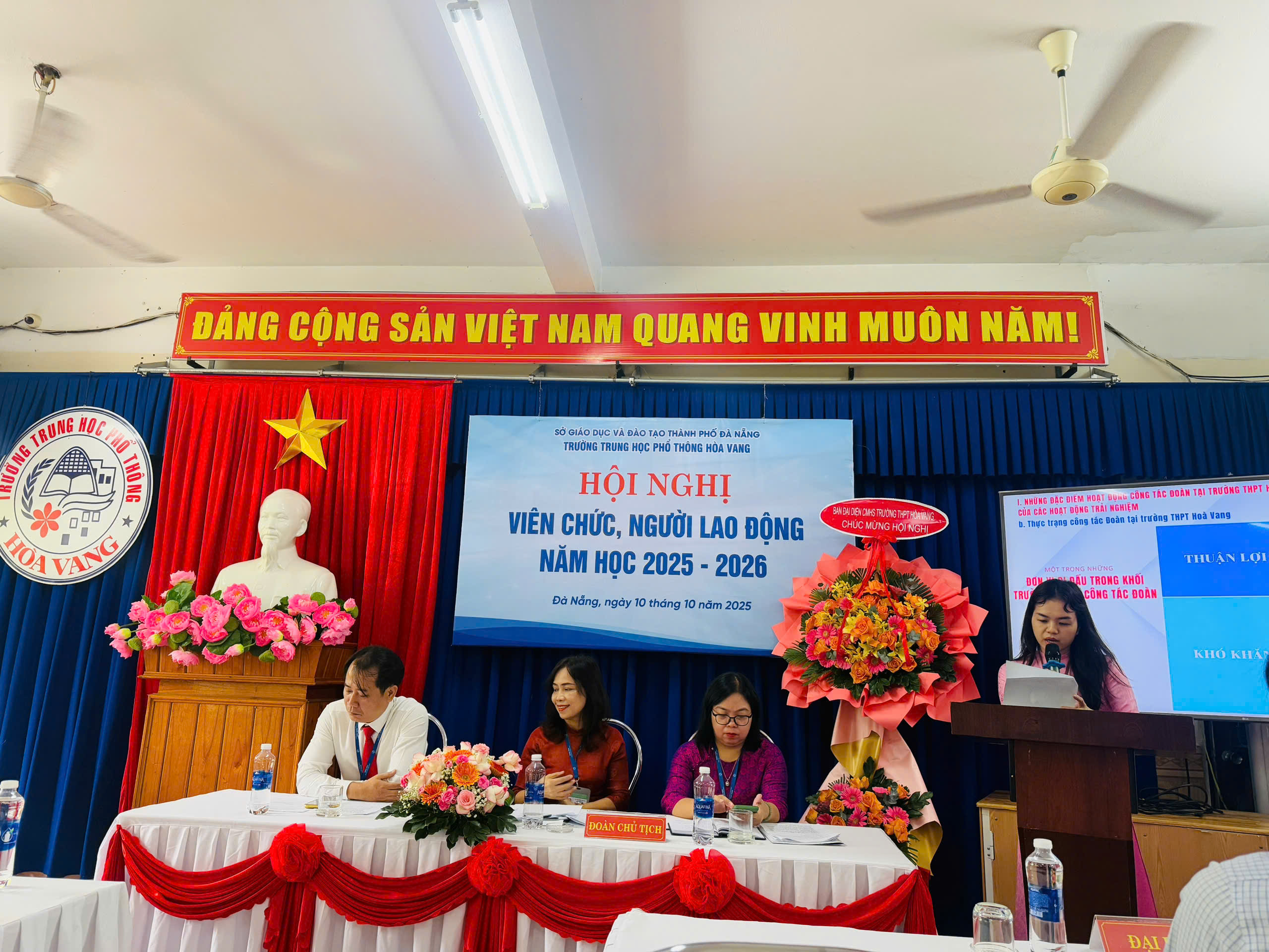 Thực hiện Công văn số 1415/SGD ĐT-VP ngày 1/10/2025 của Sở GD&ĐT thành phố Đà Nẵng về việc tổ chức Hội nghị công chức, viên chức, người lao động ngành giáo dục năm học 2025-2026, sáng nay, ngày 10/10/2025, Trường THPT Hoà Vang long trọng tổ chức Hội nghị viên chức, người lao động năm học 2025 – 2026.
